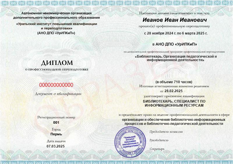 Курс обучения Библиотекарь. Организация педагогической и информационной деятельности (710ч)