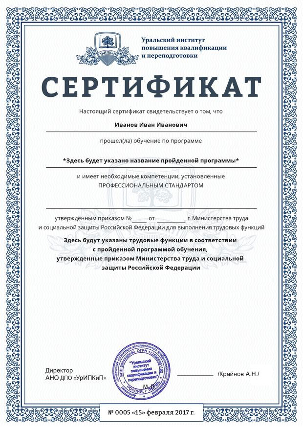 Заполненные образцы выдаваемых документов есть в описании учебных курсов и на странице «Лицензия. Документы», а также на главной странице официального сайта АНО ДПО «УрИПКиП».