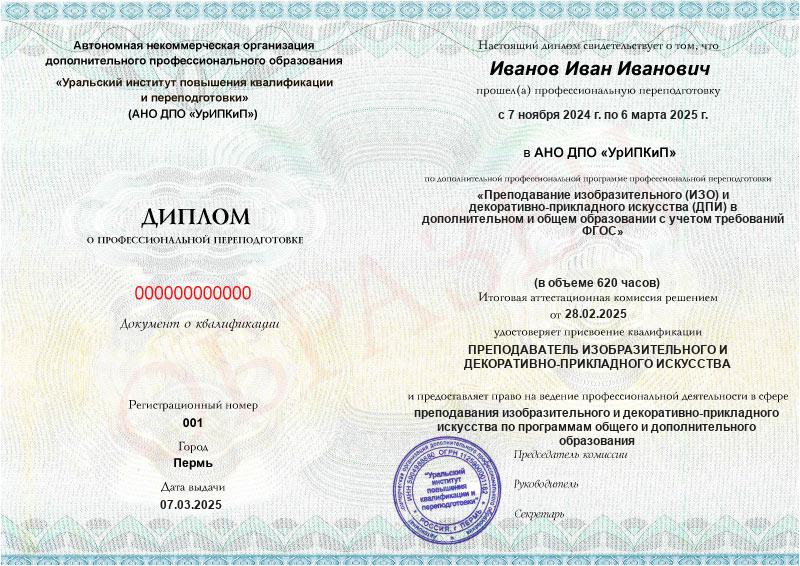 - Образец диплома о профессиональной переподготовке.