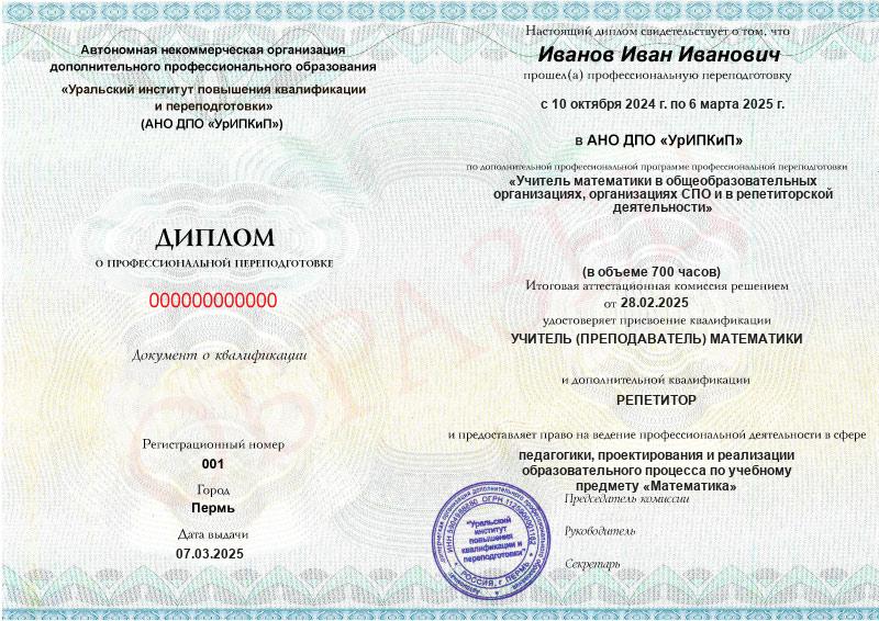По завершении программы вы получите диплом установленного образца и сможете работать преподавателем математики как очно, так и онлайн.